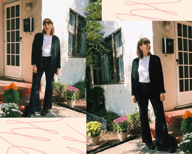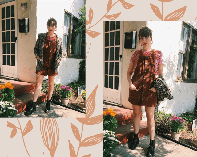 Sorry for the overuse of puns, but I couldn’t help myself. Here, I’m wearing an oversized double-breasted blazer with a matching brown overall dress. For a pop of color, I wore a casual pink velvet top. This outfit plays with texture, combining tweed, corduroy, and velvet for an overall very fall look (oops, again with the “overall” — I’M SORRY). Fall=layering, mixing, and playing with both!