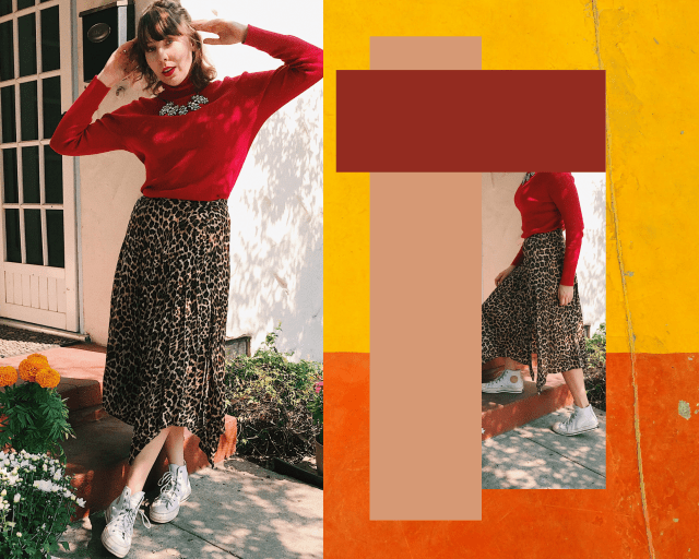 Tired of basic sweaters? Have no fear! Here’s a midi cheetah skirt with a soft red sweater that’ll keep you so warm and cozy, you won’t even need to layer with it. The Converse show you’re down for a casual night in to watch ABC Family’s 13 Nights of Halloween, but the addition of the sparkly chunky necklace says you’re also ready to go out for some spiced cider.