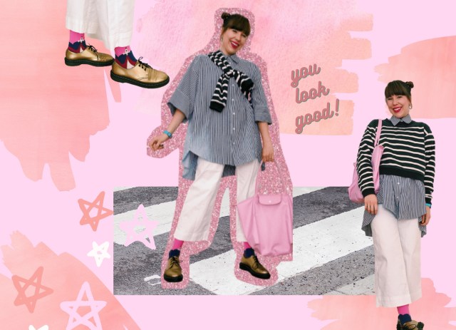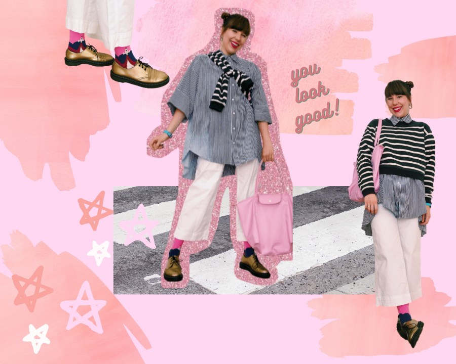 To stay in line with my love for maximalism, I added a touch of clash by wearing a striped cropped J.Crew sweater. The colors of the shirt and sweater match, but the pairing stands out beacuse of the the sweater’s bold stripes and the peep of the shirt’s collar. I wore my favorite gold Dr. Martens with pink socks that feature a plane with text (that you sadly can’t see) saying “heading towards my next mistake.” I think it fits my personality, since being an overthinker doesn’t necessarily equate to being reckless-free. The city is full of surprises and you never know who or what you’ll run into. Maybe you’ll catch some friends mid-afternoon and will find yourself at Happy Hour, despite knowing you have to drop of your mail-in ballot at the nearest dropbox (*please don’t forget to vote*).