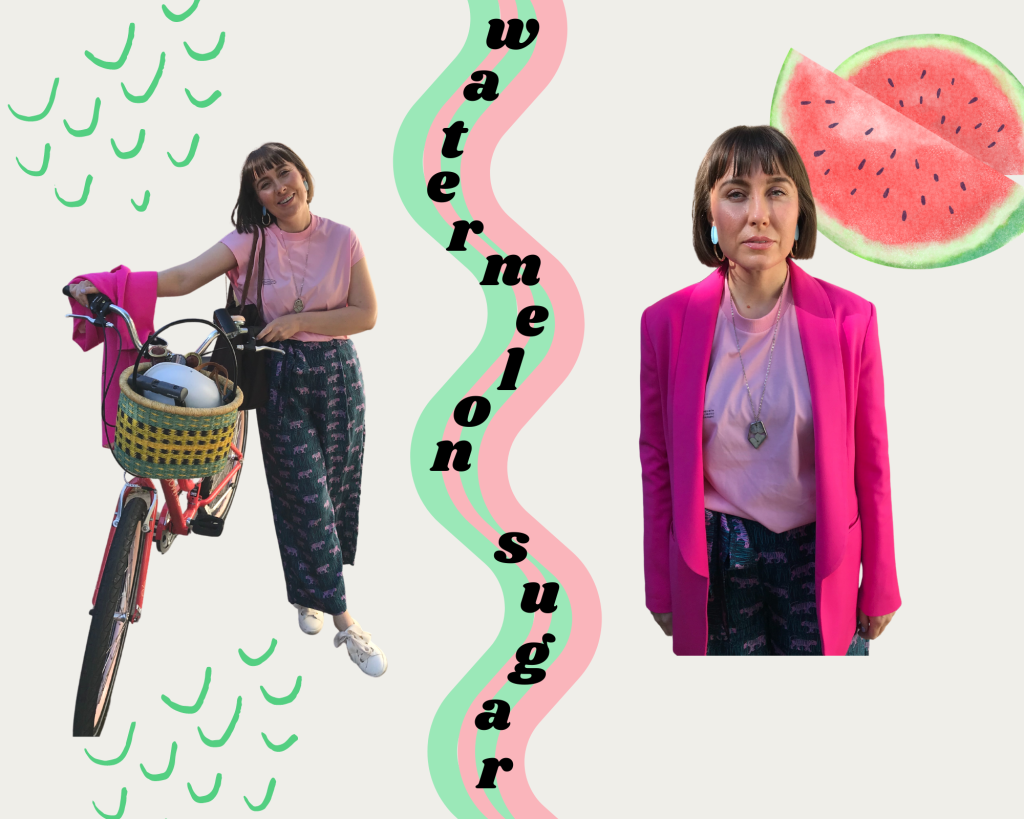 I styled her in a sleeveless flamingo pink t-shirt from Pangaia. She’s biking to happy hour and breathable clothing is a must in Sacramento’s heat. This particular cropped shirt is sustainably made out of organic cotton and is guaranteed to keep you cool in the sun. Plus, it’s made with Pangaia’s PPRMINT oil technology that’s meant to keep your shirt crisp and clean for longer, so you could wash it less, making it all the better for the planet.