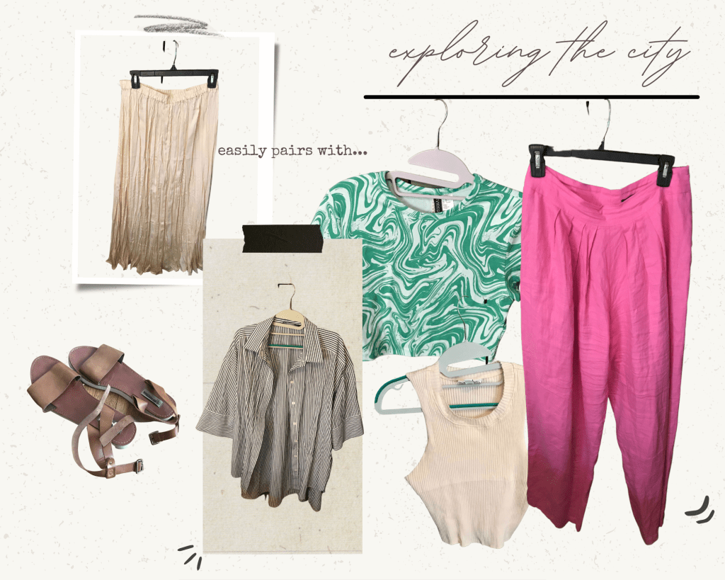 The perfect solution for this: baggy clothing. That’s why I packed my trusty oversized Zara button-down (similar). I love how I can wear it with this skirt from H&M that transforms the outfit into minimalistic chic, or with my favorite custom pink pants. The pink pants (similar) are straight-legged wide pants and with the addition of the oversized shirt on top, the outfit morphs into a statement maximalist piece.