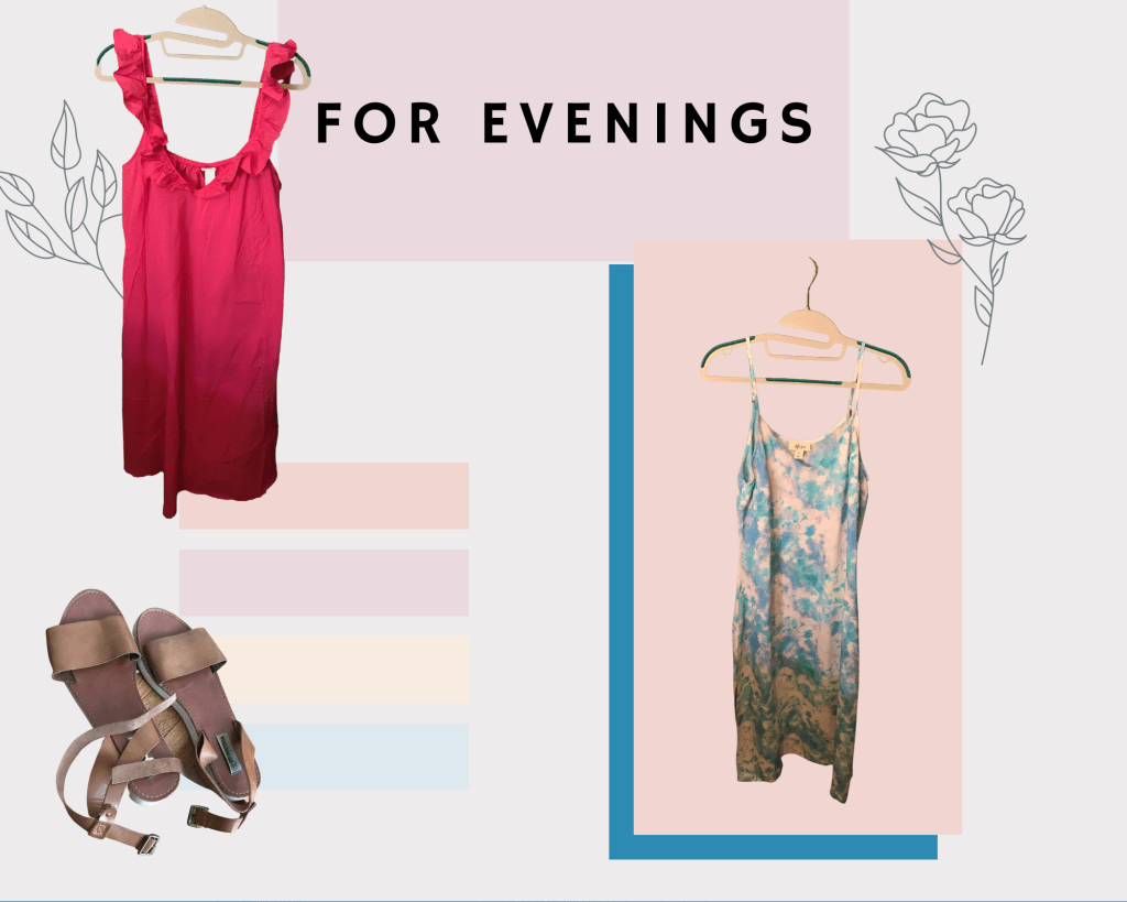 As for evening dinners, I plan on wearing this lovely hot pink H&M dress. I love its oversized fit and detailed ruffles along the chest. The second dress I packed is a tie-dye slip dress from Macy’s. Both are great options for late dinners and late night walks in the city streets.