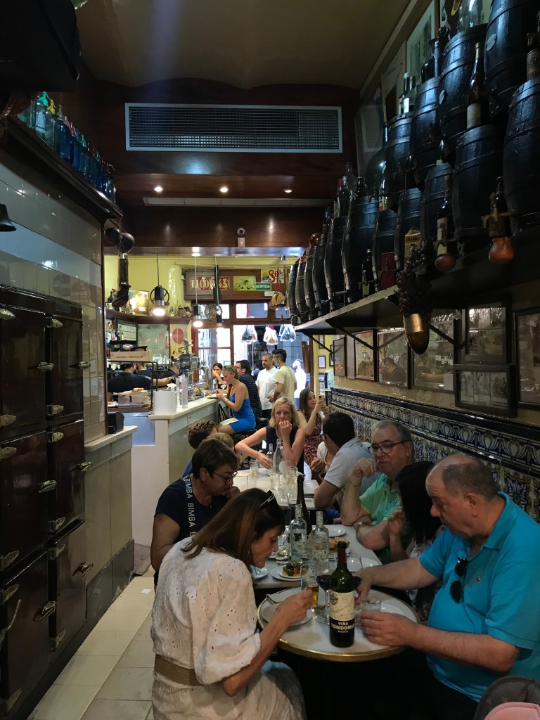 Experience elevated tapas at this lovely restaurant. We dined outside, but make sure to peek in to see its stunning decor. Decorated with bright lights and a tile floor with an intricate pattern, you’re going to want to take many pictures. This was one of our favorite tapas restaurants—their seafood was so flavorful. Make sure to order their arroz negro con chipirones y allíoli (black rice with squid)!
