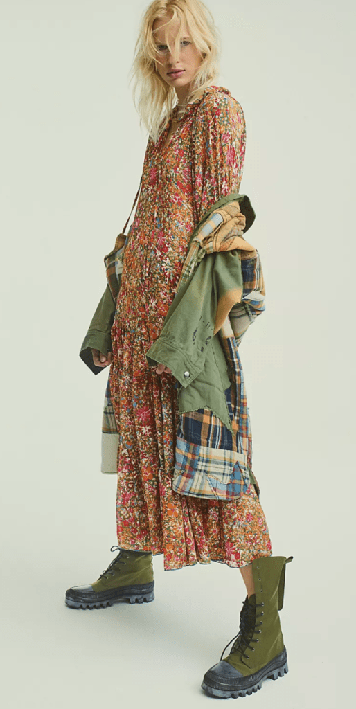 Replace your silky slip dresses with fall maxi-dresses. This floral print one from Free People features a mosaic of fall colors that pairs well with chunky boots and a loose jacket.