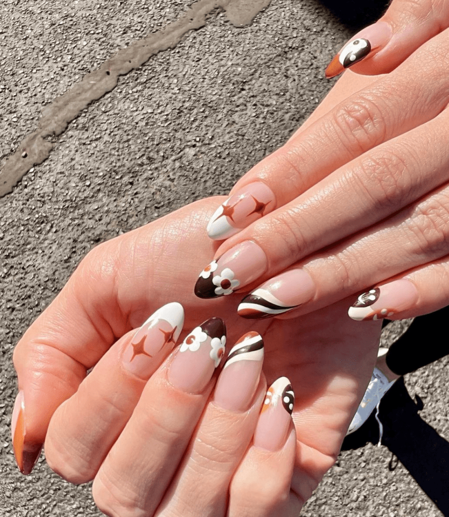 Although these nails feature classic fall colors, I love how the design incorporates smiley-faces and flowers for a little bit of funkiness.