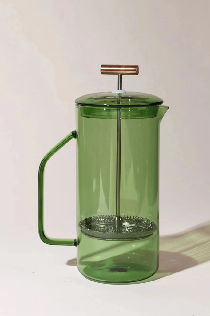 Brew a pot of coffee or hot tea in this exquisite Yield Glass French Press. It comes in a variety of pretty colors, like this moss green, a sea blue, and an orange-y amber.