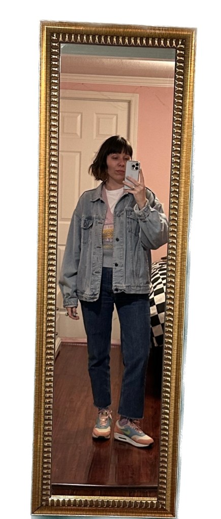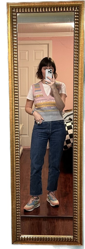 Re/done jeans (similar), Nike shoes, Uniqlo t-shirt, Ganni vest, vintage denim jacket (similar)