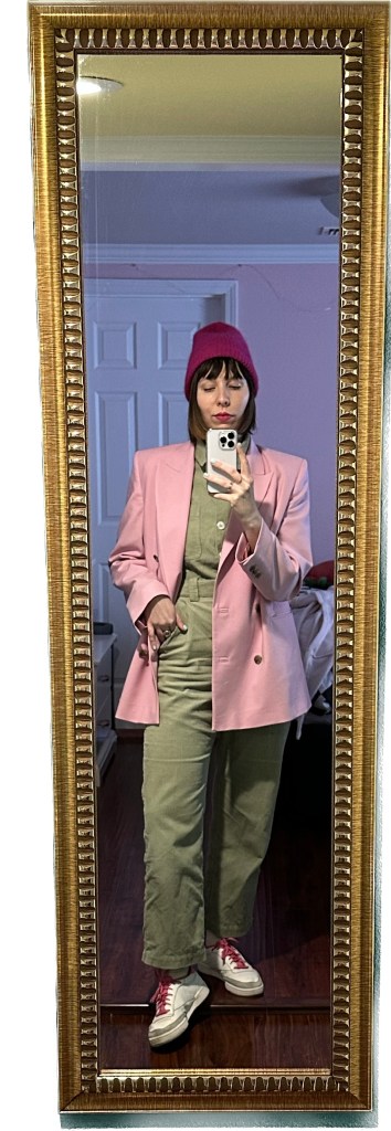 & Other Stories jumpsuit (similar in a pretty purple), & Other Stories blazer (similar), Sezane beanie, Sezane socks, Reebok Club C 85 shoes
