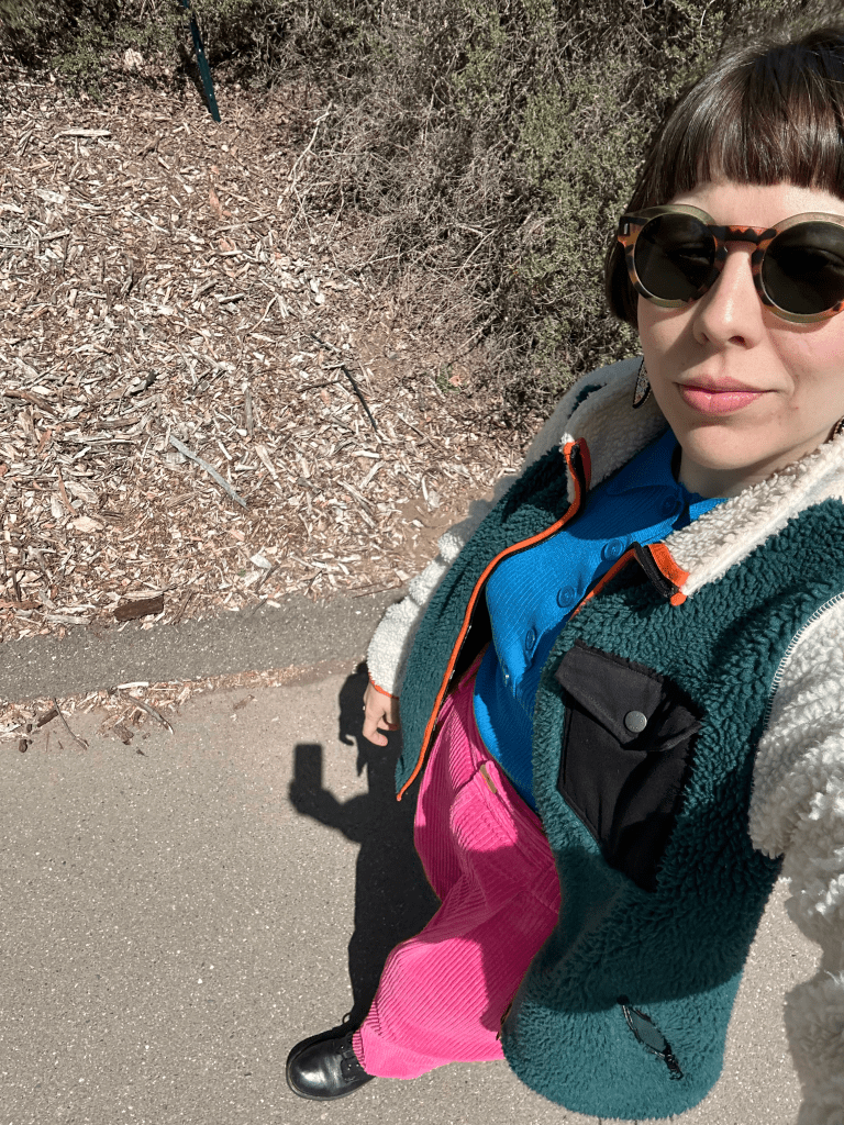 Although it’s spring, the mornings are freezing, so layering is key. On this day, I wore these hefty pink pants with a sky blue short sleeve top. A denim jacket would have been excellent with this fit, but because I wanted some extra warmth, I wore a fleece. The color-blocking and mix of textures makes this look funky and fun!