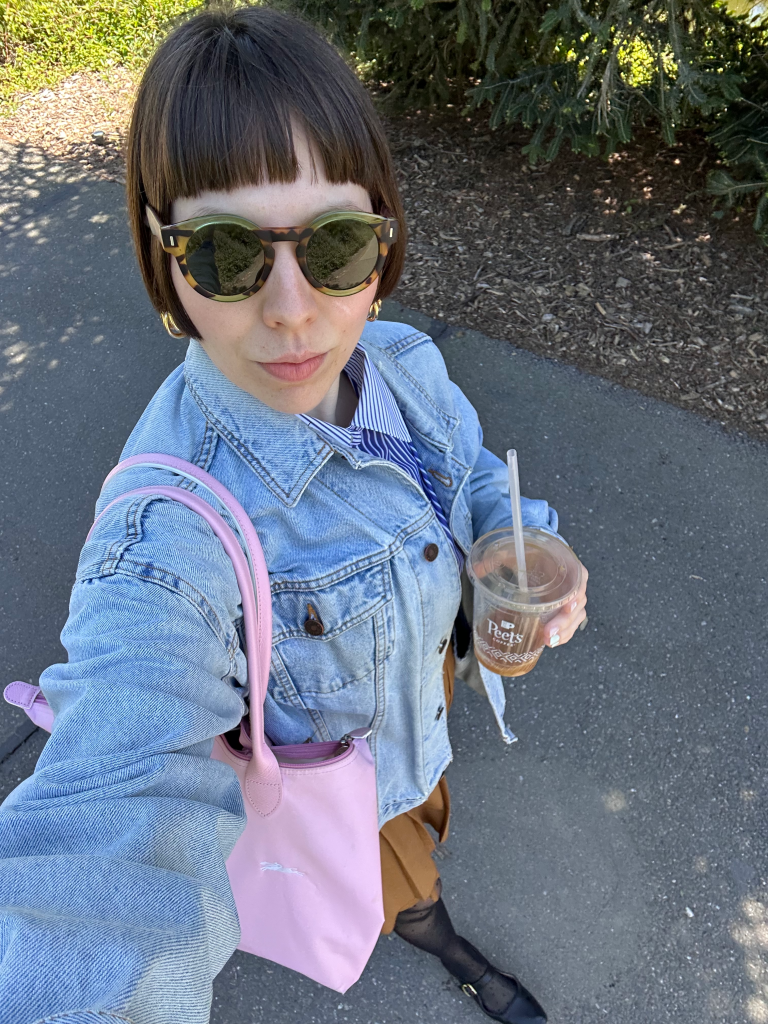 Vintage denim jacket (similar), Longchamp bag, COS skirt (available in a different color), JW ANDERSON x Uniqlo shirt (available in white), Sézane tights, Sam Edelman shoes, Tiwi sunglasses