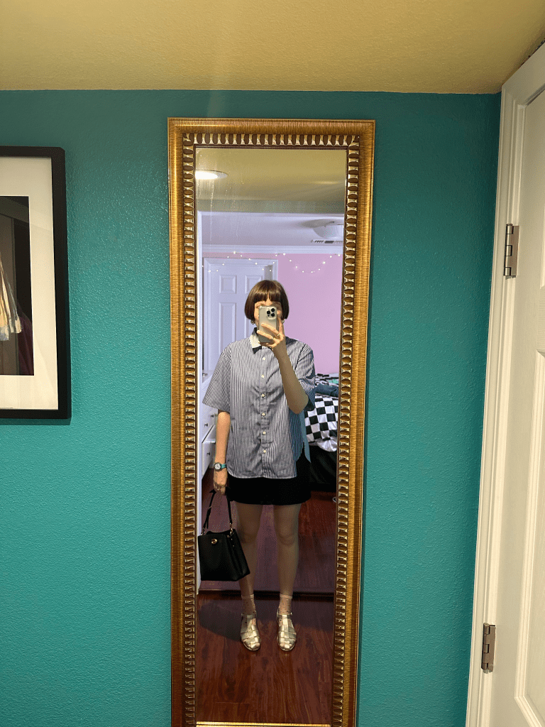 My week of outfits wouldn’t be complete without a denim jacket. Here I am rocking another vertically-striped shirt with a simple short skirt. I love the balance of this look because it feels very girly, yet has a touch of masculinity because of the oversized denim jacket.