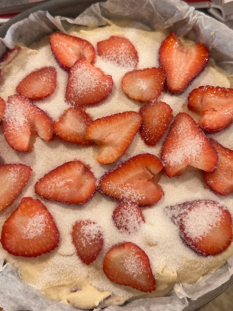 6. Using a spatula, gently fold in half the strawberries and transfer the batter to the prepared cake pan. Scatter with the remaining strawberries and sprinkle with demerara sugar. Bake until the cake is puffed, deeply golden brown, and pulling away at the sides, 45–50 minutes. (It should spring back slightly when pressed in the center and appear fully baked where the strawberries meet the cake.)