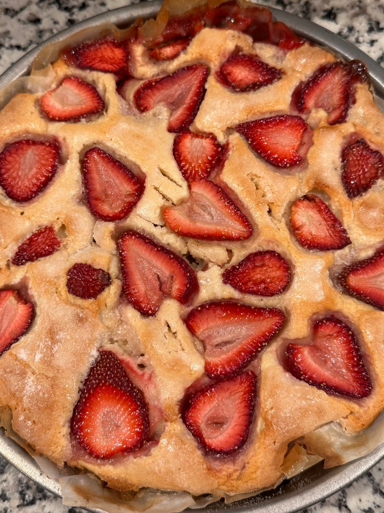 Roman compares the cake to a donut, which definitely piqued my interest. My family and I tried it the day of and I didn’t come to the same conclusion…BUT, let me tell you that the next day (and a couple of days after that), the cake actually tasted like a cake donut! Its texture is dense, yet crumble-y. Plus, I think allowing the cake to sit unrefrigerated made it soak up more of the strawberries, which made the cake resemble a donut in its taste and appearance! So, I take it all back.
