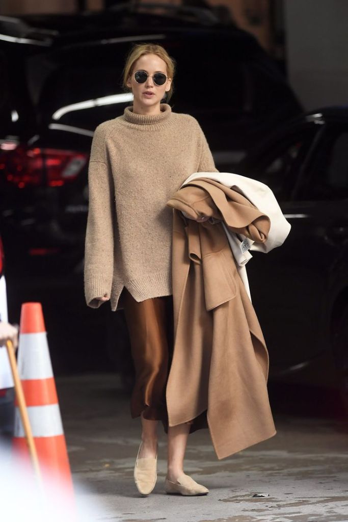 Chocolate brown is this year’s color! In the photo above, Jennifer Lawrence is wearing a chic pairing: a silk skirt with a long sweater that’s perfect for those brisk fall evenings. Don’t forget your tan peacoat! I’d pair this outfit with a caramelized apple pie—this one is sure to impress your guests.